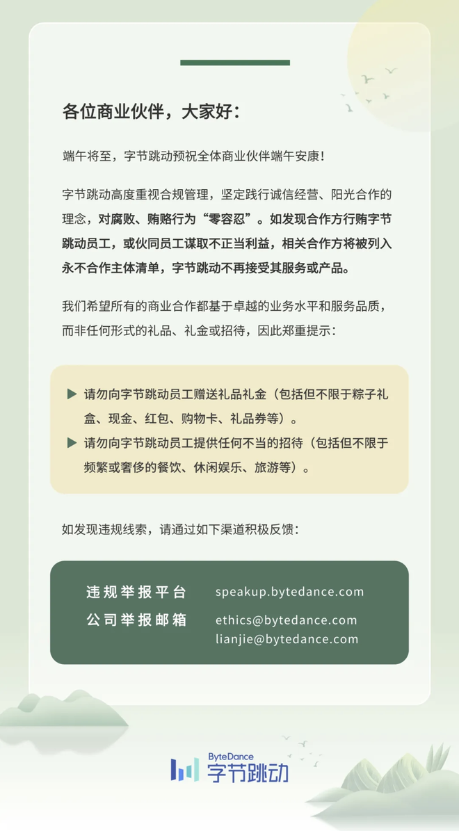字节发端午合规提示:请勿向字节员工赠送粽子礼盒、红包等