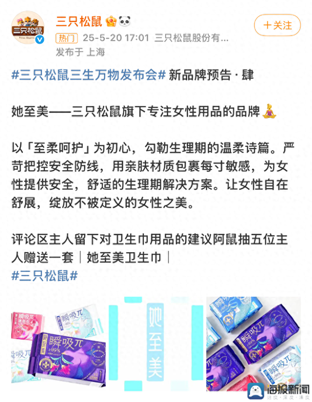 近日,三只松鼠召开了“三生万物”2025全域生态大会。会上,三只松鼠宣布推出卫生巾品牌“她至美”。这一战略动作标志着三只松鼠从单一零食赛道向全品类消费品牌的加速转型,也为其“三年200亿营收”目标注入新增长活力。