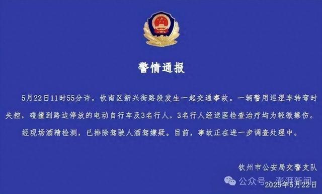 5月22日11时55分许,钦南区新兴街路段发生一起交通事故。一辆警用巡逻车转弯时失控,碰撞到路边停放的电动自行车及3名行人,3名行人经送医检查治疗均为轻微擦伤。