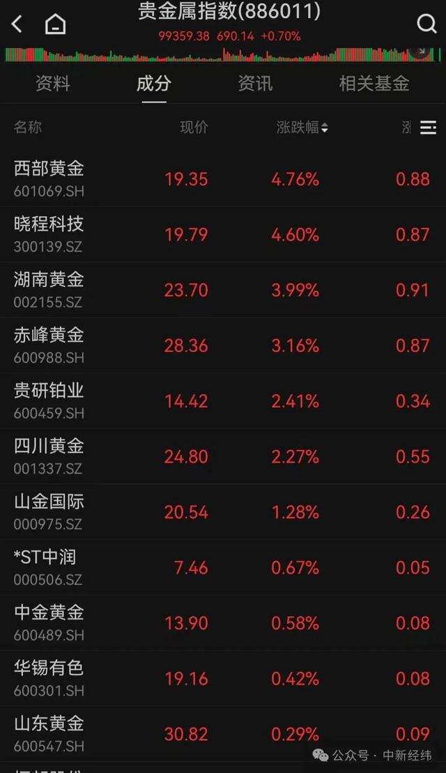 23日,A股黄金概念逆势活跃,截至收盘,莱绅通灵涨6.41%,西部黄金、晓程科技涨超4%,赤峰黄金、湖南黄金涨超3%。