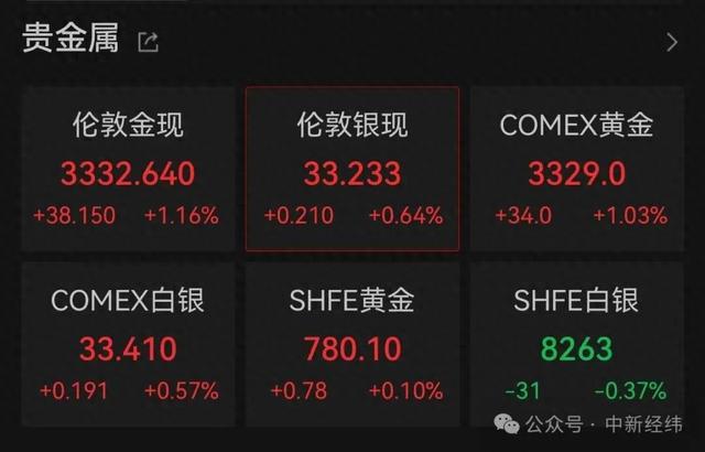 Wind数据显示,23日现货黄金日内涨超1%,站上3330美元关口,COMEX黄金也上涨1%左右。截至发稿,现货黄金报3332.640美元/盎司,COMEX黄金报3329.0美元/盎司。
