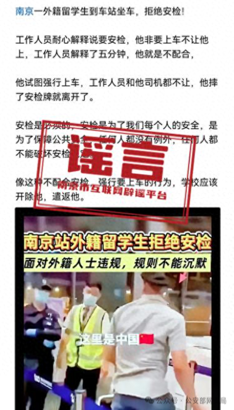 经查,网民张某燕,利用AI工具,生成 "外籍留学生强闯南京火车站安检"谣言并在互联网平台发布,误导网民关注和讨论,引发部分网民质疑火车站安检管理不力等。