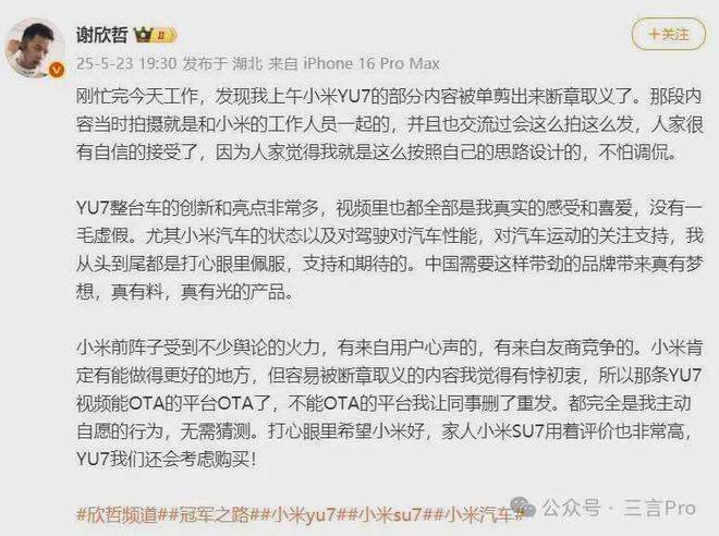 对于Shin的问答对话视频被传开,谢欣哲发文称,发现小米YU7的部分内容被单剪出来断章取义了。