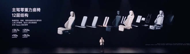 内饰配色方面,小米YU7拥有松石灰、珊瑚橙和暮影蓝三种,在舒适度和空间的考量上,新车也是做了多项优化设计,前排加入了双零重力座椅,并支持一键躺倒和10点座椅按摩。另外,座椅采用12层结构,提供了更佳的舒适性和包裹性等,并贴合人体省力曲线。空间上,按1.88米的模拟乘员来看,后排头部余量空间有77mm,膝部空间余量73mm,同时后排也支持电动无极调节的躺靠,角度在100°-135°之间。