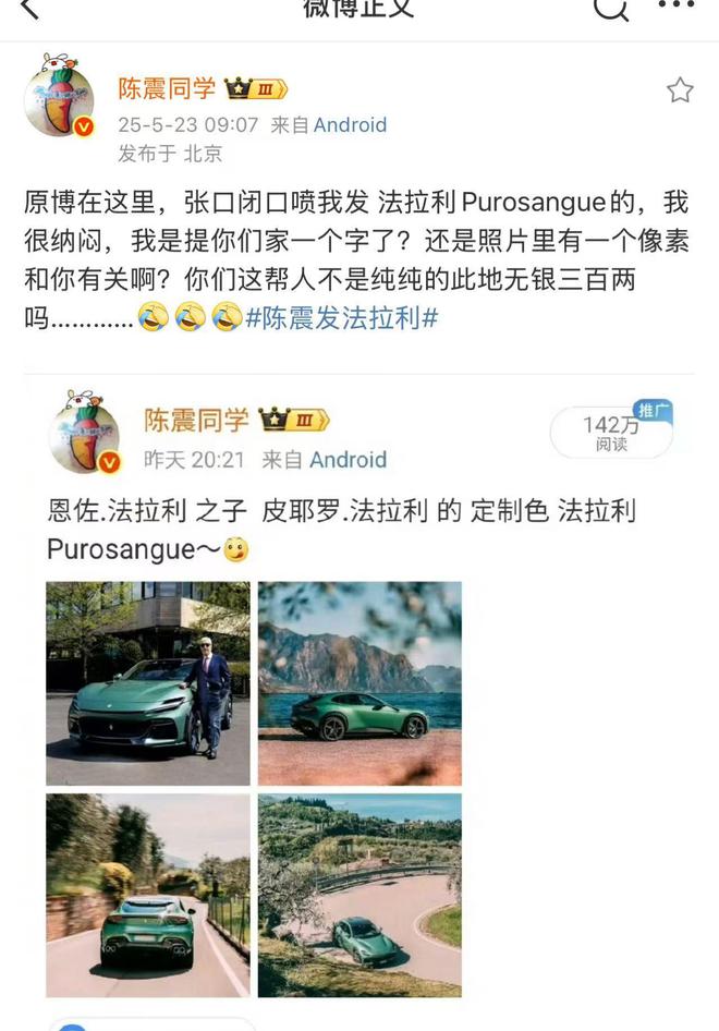 陈震说:“张口闭口喷我发 法拉利Purosangue的,我很纳闷,我是提你们家一个字了?还是照片里有一个像素和你有关啊?你们这帮人不是纯纯的此地无银三百两吗………”