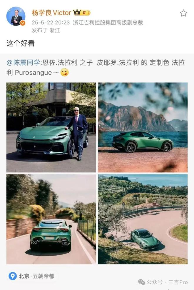 此后,汽车大V陈震也发布多张法拉利Purosangue的照片,配文:恩佐.法拉利 之子 皮耶罗.法拉利 的 定制色 法拉利Purosangue。吉利控股集团高级副总裁杨学良转发并表示,这个好看。