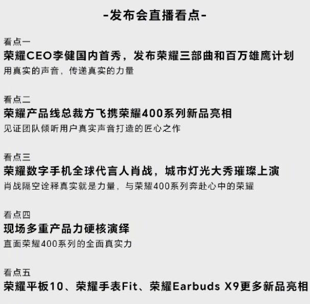 荣耀手机今日发文宣布,荣耀400系列将5月28日发布。在荣耀新任CEO李健将在此次发布会上完成国内首秀,具体安排如下: