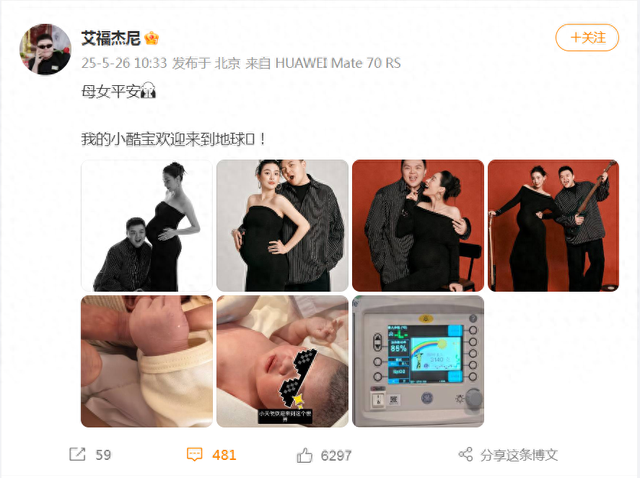 艾福杰尼晒出多张宝宝照片,并写道:“母女平安,我的小酷宝欢迎来到地球。”