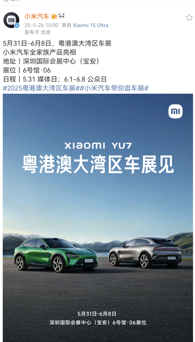 5月26日,小米汽车宣布5月31日至6月8日,小米汽车将携全家族产品,即小米SU7系列以及即将上市的小米YU7亮相粤港澳大湾区车展。