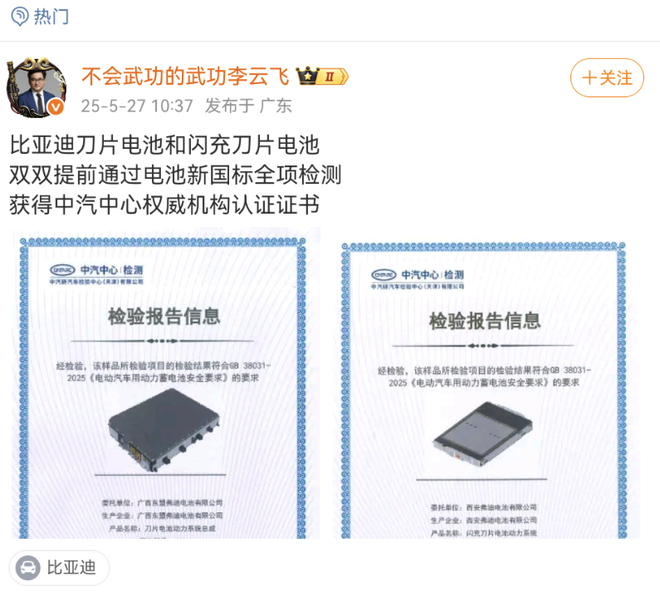 5月27日,比亚迪集团品牌及公关处总经理李云飞表示,比亚迪刀片电池和闪充刀片电池已提前通过新修订的 GB 38031—2025《电动汽车用动力蓄电池安全要求》强制性国家标准全项检测,获得中汽中心认证证书。