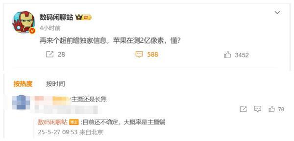 5月27日消息,博主数码闲聊站爆料,苹果正在测试2亿像素,大概率会将其应用到主摄端。