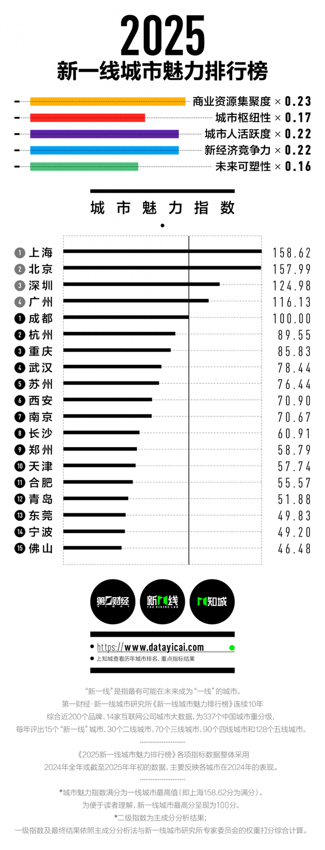 《新一线城市魅力排行榜》的指标体系包含了商业资源集聚度、城市枢纽性、城市人活跃度、新经济竞争力和未来可塑性五大一级维度。榜单的一级与二级维度权重以新一线城市研究所专家委员会打分的方式计入,二级维度以下指标数据则采用主成分分析法。榜单各细分维度指标主要采用2024年全年或者截至2025年年初的数据计算得出。