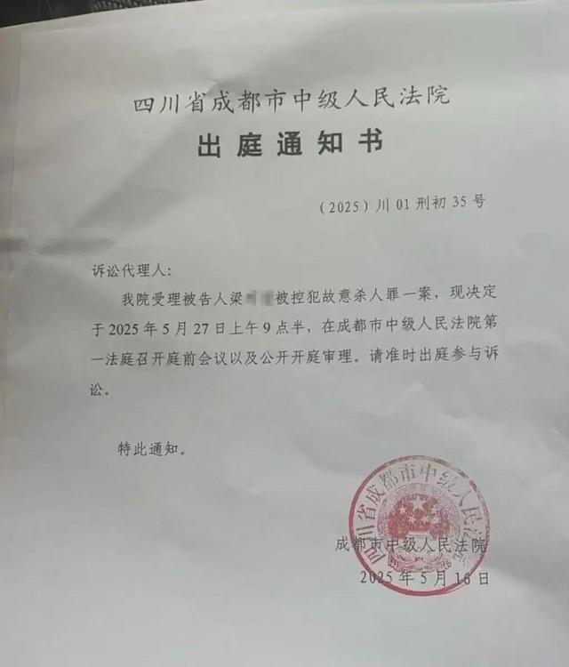 案发近一年后,该案原定于5月27日上午9点半在成都市中级人民法院公开开庭审理,检方以故意杀人罪对梁某某提起公诉。