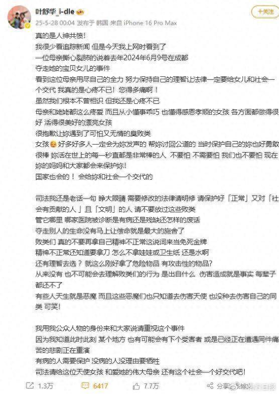 28日凌晨,女子演唱组合i-dle成员叶舒华,时隔一年更新微博,为成都女子家门口被害案受害者发声。