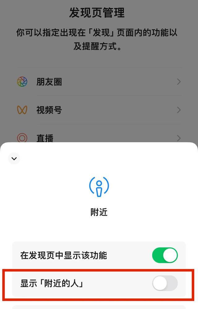 微信【设置】→【通用】→【发现页管理】→【附近】关闭该功能。