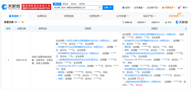 天眼查App显示,近日,斑头雁(杭州)智能科技有限责任公司发生工商变更,新增浙江阿里巴巴云计算有限公司、上海起创创业投资管理中心(有限合伙)为股东,注册资本由约392万人民币增至约490万人民币,同时部分高管发生变更。