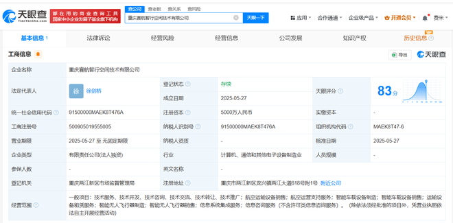 天眼查App显示,近日,重庆赛航智行空间技术有限公司成立,法定代表人为徐剑桥,注册资本5000万人民币,经营范围包括航空运输设备销售、航空运营支持服务、智能车载设备制造、智能车载设备销售、运输设备租赁服务、智能无人飞行器制造等,由赛力斯旗下重庆瑞驰汽车实业有限公司全资持股。值得一提的是,重庆凤凰空间技术有限公司也于近日成立,由重庆瑞驰汽车实业有限公司等共同持股。
