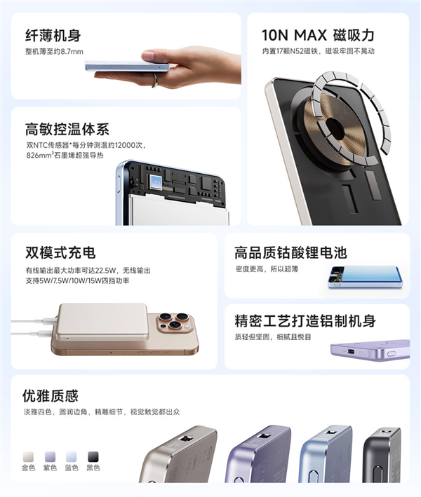 配备高敏控温体系,双NTC传感器每分钟测温12000次,结合826mm²石墨烯超强导热,实现低温充电。
