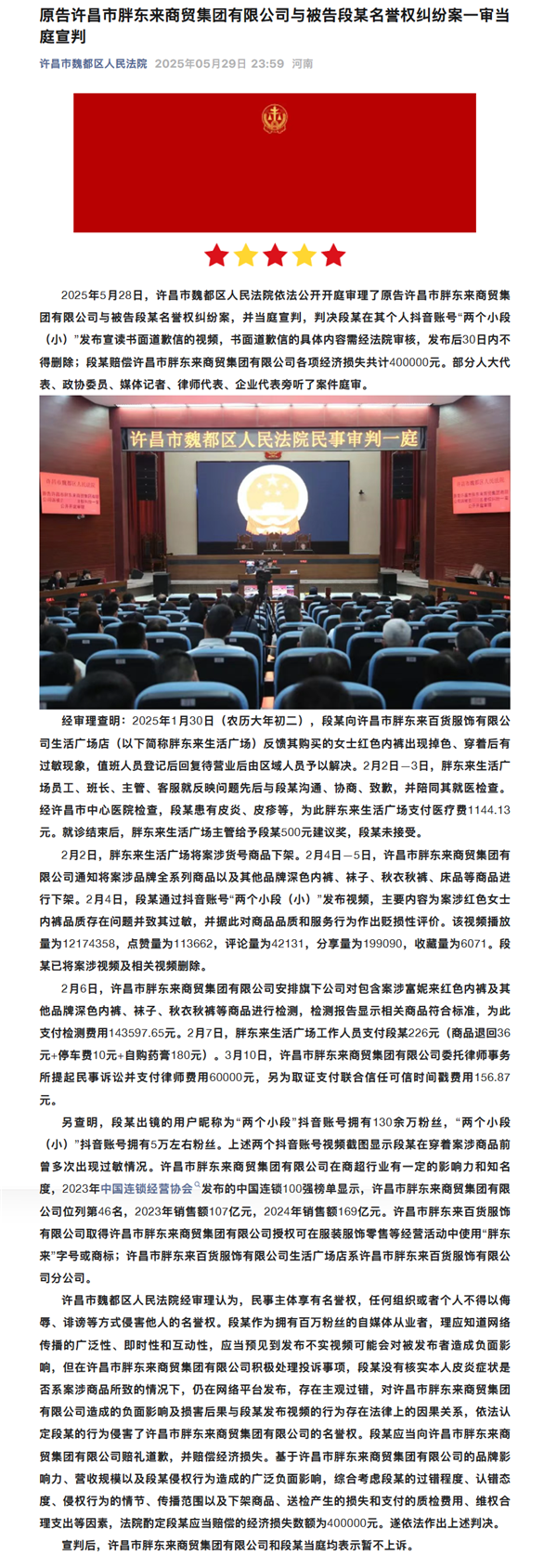 近日,该案件已经宣判:判决段某在其个人抖音账号"两个小段(小)"发布宣读书面道歉信的视频,书面道歉信的具体内容需经法院审核,发布后30日内不得删除;段某赔偿许昌市胖东来商贸集团有限公司各项经济损失共计400000元。