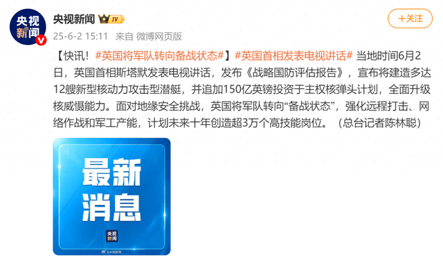 当地时间6月2日,英国首相斯塔默发表电视讲话,发布《战略国防评估报告》,宣布将建造多达12艘新型核动力攻击型潜艇,并追加150亿英镑投资于主权核弹头计划,全面升级核威慑能力。面对地缘安全挑战,英国将军队转向“备战状态”,强化远程打击、网络作战和军工产能,计划未来十年创造超3万个高技能岗位。