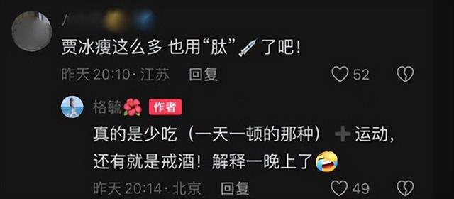 贾冰减肥效果明显,也有网友质疑其打针减肥。贾冰妻子则回复,否认丈夫打针瘦身:“真的就是少吃(一天一顿的那种)+运动。”