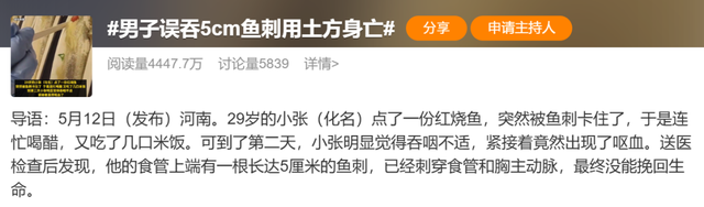 随后“男子误吞5cm鱼刺用土方身亡”的内容,冲上热搜。