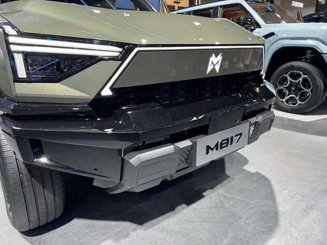 猛士M817采用了硬朗和夸张的造型设计,呈现出一种未来机甲的风格。作为新能源车型,新车在光源的设计和布置上也用到了极致,车头部分的日行灯带、中网灯带和车头LOGO,点亮以后的辨识度还是极高的。