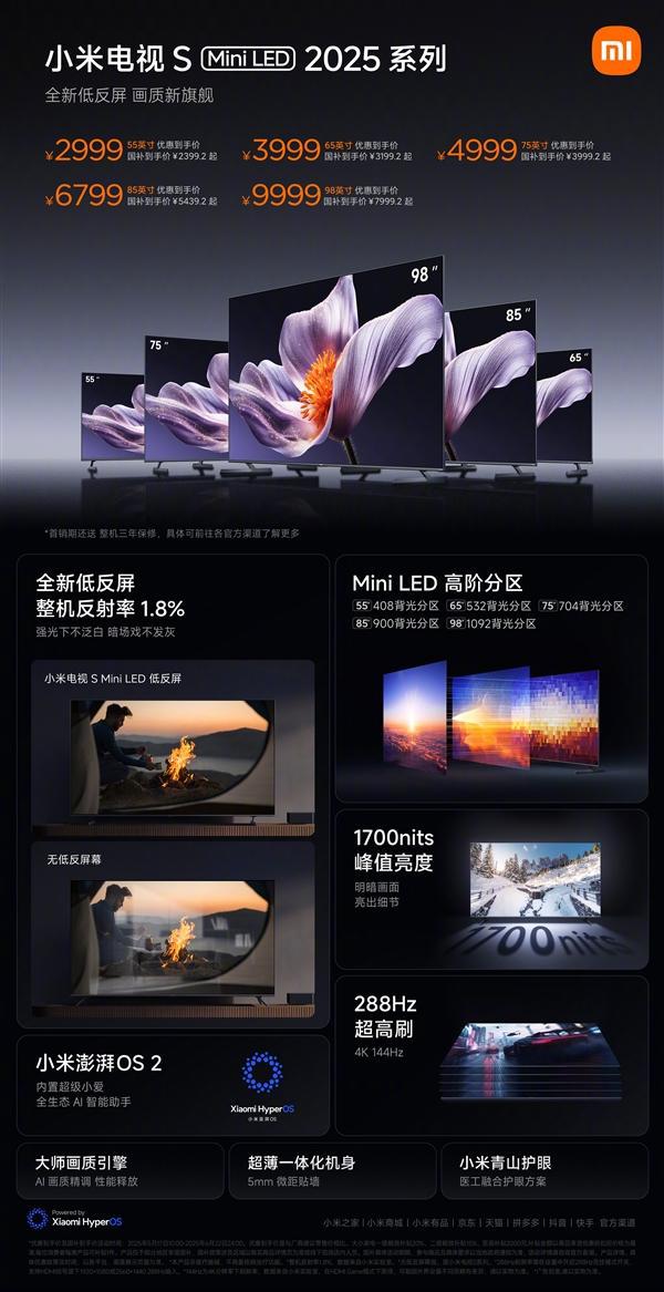 小米电视S Mini LED 2025系列98英寸版开售:国补价7999.2元