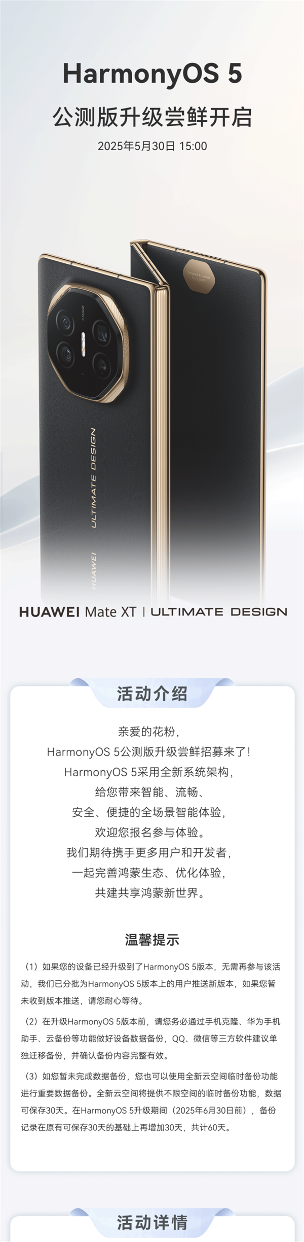 据华为官方介绍,Mate XT近日已经开启HarmonyOS 5公测版尝鲜升级,所有用户都能报名参与。