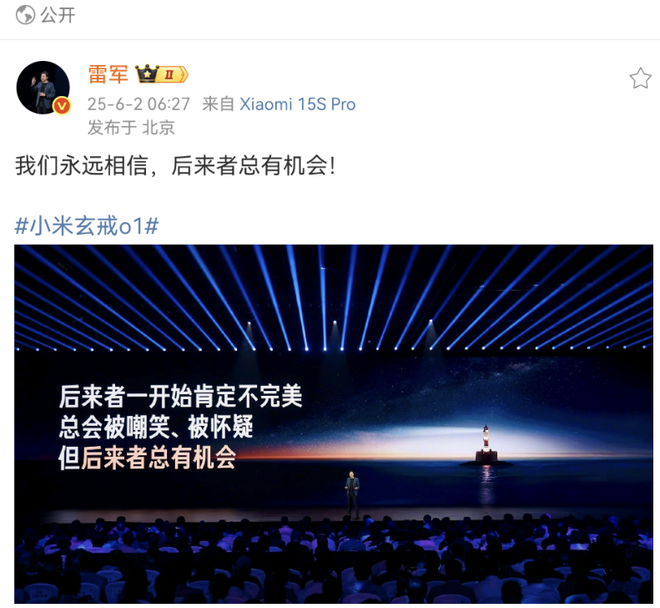 雷军:永远相信后来者总有机会 访客 2025-06-02 17:49:50 29845 抢沙发 默认 6月2日早晨,雷军发微博称,“我们永远相信,后来者总有机会!”。 标签: 有机会 后来者 海报 阅读 QQ 分享 微博分享 微信分享 分享 上一篇卢伟冰:竞争不是小米的挑战 关键在于价值观和管理体系 下一篇蚂蚁集团成立信息技术新公司,注册资本1000万 卢伟冰:竞争不是小米的挑战 关键在于价值观和管理体系上一篇 蚂蚁集团成立信息技术新公司,注册资本1000万下一篇 相关推荐 有机会后来者 错过再等一年!七彩虹iGame品牌日来袭:显卡以旧换新回归 2025-04-30 发表评论取消回复 快捷回复: 评论列表 (暂无评论,29845人围观)参与讨论 还没有评论,来说两句吧...