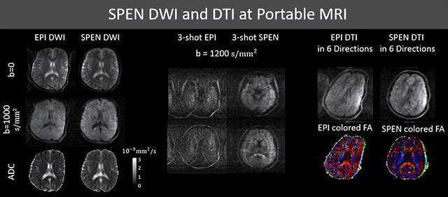 获奖研究创新性地开发了适用于无多通道并行加速便携设备的SPEN(时空编码)采集方法。与传统的EPI(平面回波成像)技术相比,该方法的欠采样图像展现出更小的几何失真。相关成果已发表于磁共振领域权威期刊《Magnetic Resonance in Medicine》。值得关注的是,研究团队在评奖报告中进一步展示了SPEN技术的系列创新拓展,包括SPEN DTI、SPEN RF-encoded及xSPEN等技术在便携式磁共振设备上的转化应用。这些突破不仅推动了低场磁共振技术的发展,更为便携式MRI设备的临床转化应提供了关键技术支撑。