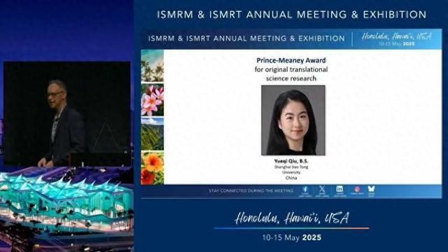 Prince-Meaney Translational Science Award是ISMRM Young Investigator Award三大奖项之一,是ISMRM颁发的磁共振基础科学转化研究领域最高荣誉。评选采用论文评审、大会答辩及专家组终审三重遴选机制,每年仅授予全球范围内最具临床应用价值的突破性研究成果。