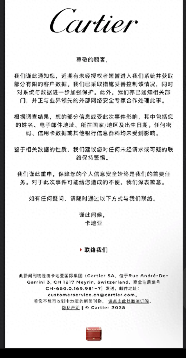 邮件内容显示,近期有未经授权者短暂进入我们系统并获取部分有限的客户数据。我们已采取措施妥善控制该情况,同时对系统与数据进一步加强保护。