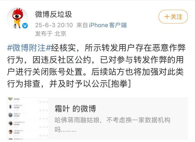 对此,微博反垃圾回应称,“经核实,所示转发用户存在恶意作弊行为,因违反社区公约,已对参与转发作弊的用户进行关闭账号处置。后续站方也将加强对此类行为排查,并及时予以公示。”