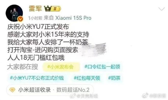 图片信息显示,小米集团创始人、董事长兼CEO雷军发文表示,为庆祝小米YU7正式发布,给每人安排了一杯奶茶,并提供了相应的红包领取口令。 (贝壳财经)