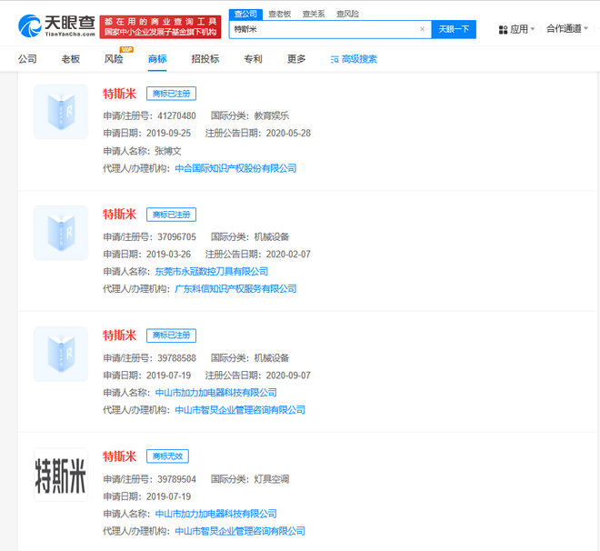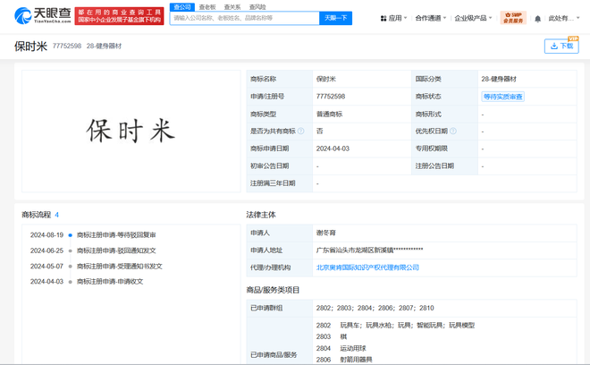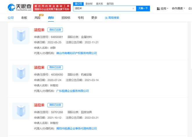 天眼查知识产权信息显示,“保时米”已被申请注册为商标,申请人包括安徽某电商公司、中山某品牌管理公司、佛山某家具公司及多位自然人等,不过,上述商标多已被驳回,此外,“特斯米”“法拉米”也已被申请注册为商标,申请人包括惠州某信息技术公司、东莞某刀具公司、深圳某投资公司及多位自然人等,部分商标已注册成功。