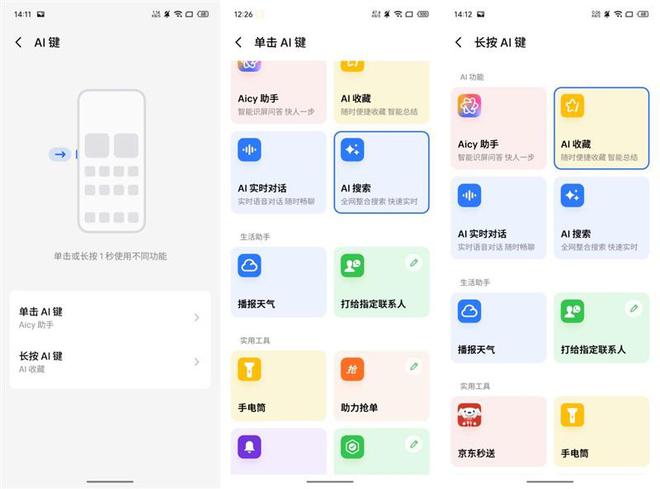 结合手机侧面的AI按键操作,可通过短按与长按两种快捷方式调用不同功能。