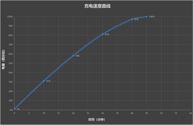经过测试,电量从1%开始充电,10分钟电量达到31%,20分钟电量过半,达到58%,30分钟电量充到81%,最终完全充满用时45分钟。