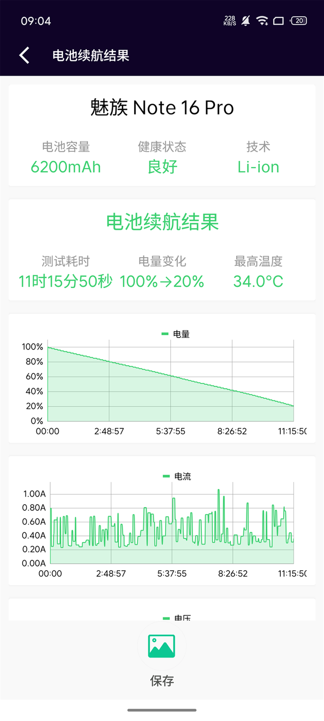 经过电池狗狗不间断测试,魅族Note 16 Pro的电量从100%消耗至20%用时11小时15分钟,经过折算满电续航大约可以达到14个小时,这也是魅族有史以来续航能力最顶的手机。