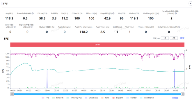 国民手游《王者荣耀》在极高帧率下可开启高清画质,在特效拉满的前提下进行一局5V5的团战测试,帧率可稳定在120FPS基准线上,在多人同时释放大招的时候会出现掉帧现象,最终游戏的平均帧率稳定在了118.2FPS。