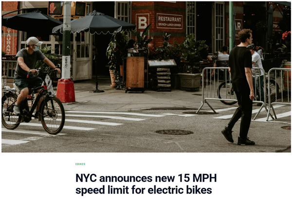在此之前,纽约市电动自行车的限速为25英里/小时(约40公里/小时),而美国大部分地区根据3类电动自行车标准(无油门的电动自行车),法定限速为28英里/小时(约45公里/小时);对于带油门的电动自行车,多数州执行20英里/小时(32公里/小时)的限速。