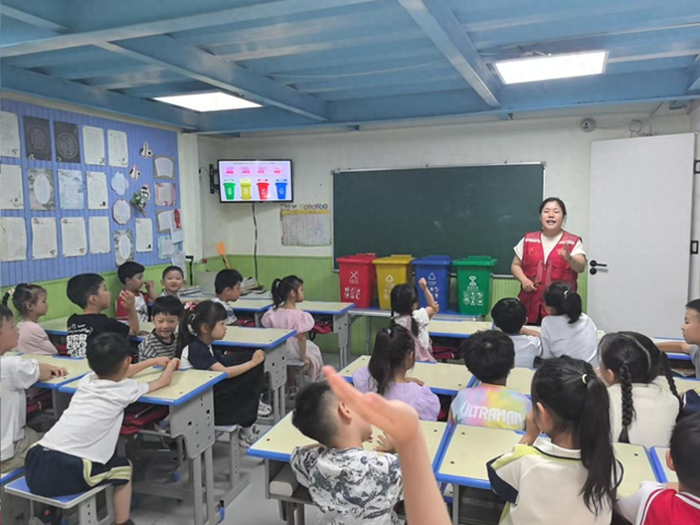 课堂上,教室前方整齐摆放着红、黄、蓝、绿四类垃圾桶模型,与 PPT 展示的分类标识相呼应。身穿红色志愿背心的工作人员化身为 “环保讲师”,借助PPT生动讲解垃圾分类知识。从四类垃圾桶的颜色标识,到不同垃圾的投放要点,工作人员以通俗易懂的语言,结合趣味问答,引导学生积极参与互动。工作人员还通过播放垃圾分类科普视频,让学生直观了解垃圾处理流程及分类意义,从源头减少垃圾污染。
