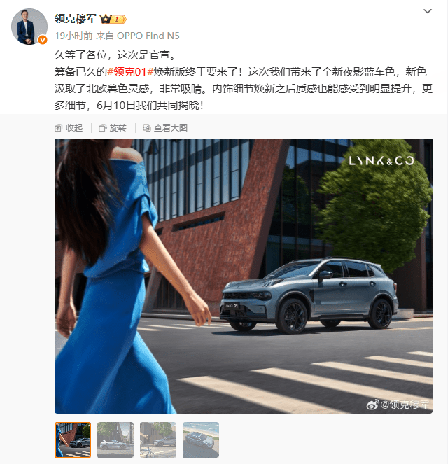 6月5日报道6月4日,领克汽车副总经理穆军通过社交媒体正式发布领克01(参数丨图片)焕新版官图,并宣布新车将于6月10日正式亮相。作为领克品牌的开山之作,01焕新版属于常规改款车型,最大变化在于新增“夜影蓝”车色,并针对内饰细节进行优化,提升整体质感。相较于现款领克01,新车虽并未对外观进行大幅调整,但通过全新配色和内饰升级,进一步强化个性化与豪华感。