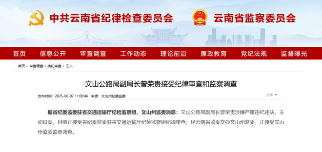 2025年6月7日,据“清风云南”公众号消息:文山公路局副局长曾荣贵涉嫌严重违纪违法,主动投案,目前正接受省纪委监委驻省交通运输厅纪检监察组纪律审查;经云南省监委交办文山州监委,正接受文山州监委监察调查。