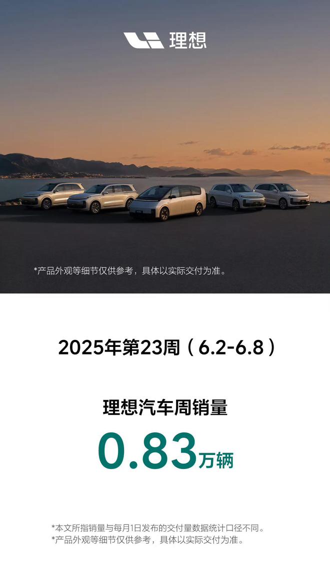 理想汽车第23周周销量0.83万辆 访客 2025-06-10 16:37:09 53710 抢沙发 默认 理想汽车今日发布最新周销量。2025年第23周(6.2-6.8),理想汽车周销量0.83万辆。 标签: 销量 理想 海报 阅读 QQ 分享 微博分享 微信分享 分享 上一篇抖音:批量水军账号冒充商家攻击抖音电商 下一篇13家汽车品牌将支持苹果车钥匙 抖音:批量水军账号冒充商家攻击抖音电商上一篇 13家汽车品牌将支持苹果车钥匙下一篇 相关推荐 销量理想 外资豪华车在华销量下滑,二手车市场动荡,国产车企市场抢占战升级 2025-12-14 保时捷中国CEO盛赞中国车企创新速度,每日产品更新迭代表现惊人 2025-12-12 苹果iPhone 17 Pro/Pro Max降价促销,最高直降300元,起售价低至8699元起 2025-12-08 理想汽车OTA 8.1更新发布,支持绑定理想AI眼镜新功能 2025-12-07 极石汽车第2万辆成功下线,迈向大规模生产的新里程碑 2025-12-07 理想AI眼镜Livis,未来科技视界的理想附件正式发布 2025-12-04 iPhone 17系列销量火爆背后的创新不足质疑,王自如深度剖析 2025-12-04 零跑汽车11月交付量突破7万,同比增长超75% 2025-12-01 发表评论取消回复 快捷回复: 评论列表 (暂无评论,53710人围观)参与讨论 还没有评论,来说两句吧...