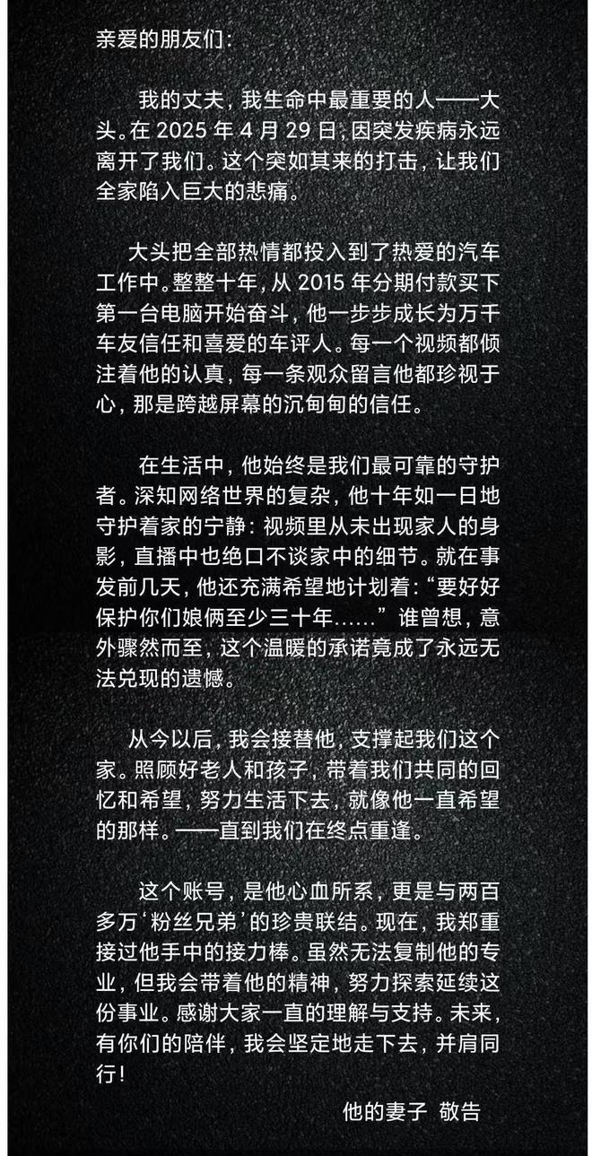 6月9日,百万网红车评人“大头评车”妻子发文:“我的丈夫,我生命中最重要的人——大头,在2025年4月29日因突发疾病永远离开了我们。这个突如其来的打击,让我们全家陷入巨大的悲痛。就在事发前几天,他还充满希望地计划着:'要好好保护你们娘俩至少三十年。'谁曾想,意外骤然而至,这个温暖的承诺竟成了永远无法兑现的遗憾。”