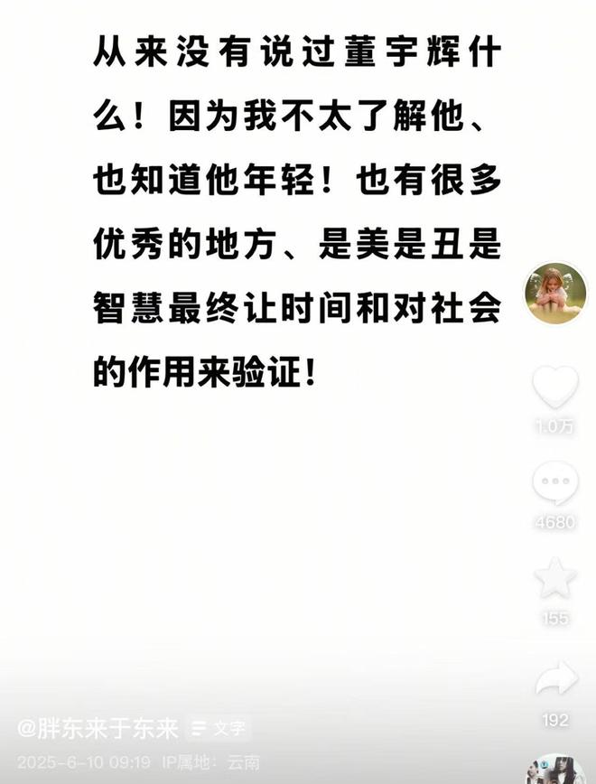 今日,胖东来创始人于东来发文称:“从来没有说过董宇辉什么,因为我不太了解他、也知道他年轻!也有很多优秀的地方、是美是丑是智慧最终让时间和对社会的作用来验证!”