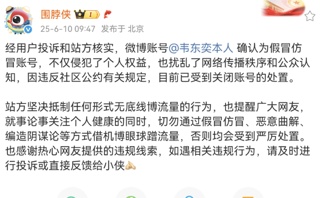 6月10日,微博官方发布公告称,经用户投诉和站方核实,微博账号“@韦东奕本人”被确认为假冒仿冒账号,该账号不仅侵犯了个人权益,还扰乱了网络传播秩序和公众认知。因违反社区公约相关规定,该账号已被关闭,其IP属地为广西。此前,曾有公司试图抢注“韦东奕”商标,涉及服装鞋帽、广告销售、教育娱乐等类别,但目前该商标申请已被驳回并处于无效状态。