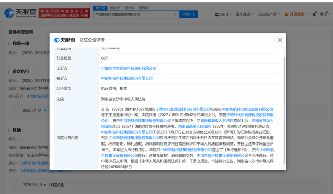 天眼查App显示,近日,因中创新航(03931.HK)未履行致歉义务,宁德时代(300750)申请强制执行,湖南省长沙市中级人民法院公告宁德时代新能源科技股份有限公司与中创新航科技集团股份有限公司等不正当竞争纠纷一案民事判决书。