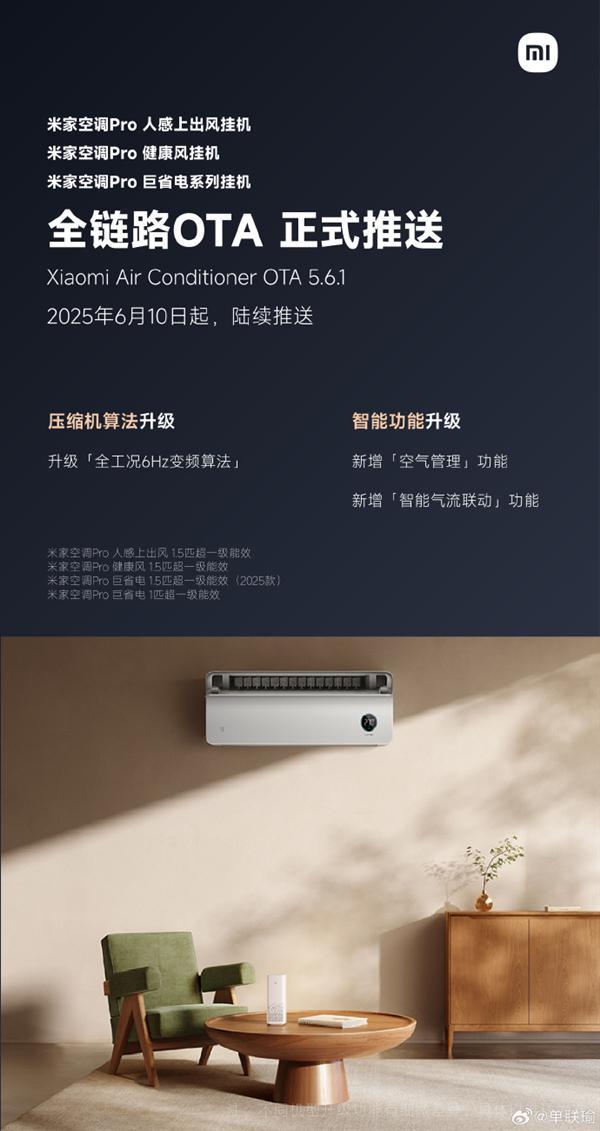 6月11日消息,小米集团大家电部总经理单联瑜宣布,米家空调Pro系列OTA今日起陆续推送!